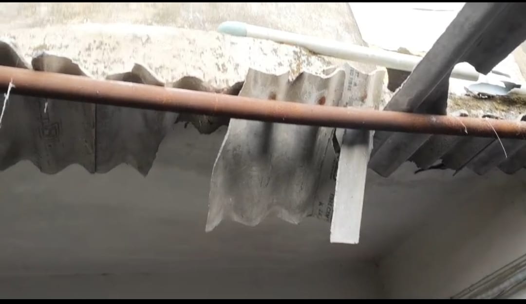 यहां एक मकान के ऊपरी हिस्से का छज्जा अचानक टूटकर नीचे गिर गया, जिससे नीचे निवास कर रहा परिवार बाल-बाल बच गया।