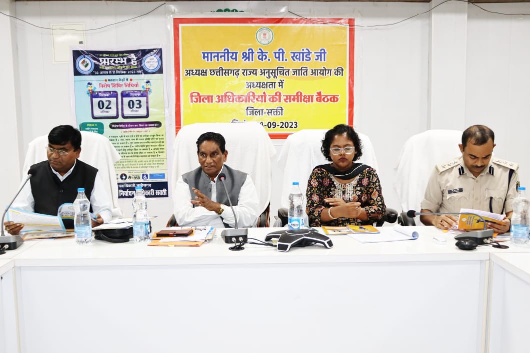 सक्ती, छत्तीसगढ़ राज्य अनुसूचित जाति आयोग के अध्यक्ष श्री के. पी. खाण्डे ने आज कलेक्ट्रेट सभाकक्ष में विभागीय अधिकारियों की समीक्षा बैठक ली। अनुसूचित जाति आयोग के अध्यक्ष श्री के.पी. खाण्डे ने बैठक में बताया कि छत्तीसगढ़ राज्य अनुसूचित जाति आयोग एक संवैधानिक संस्था है। इस वर्ग के कल्याण के लिए संचालित योजनाओं की समीक्षा के साथ ही इस वर्ग के साथ होने अन्याय पर अंकुश लगाना और पीड़ितों को न्याय दिलाना आयोग की प्राथमिकताओं में है।