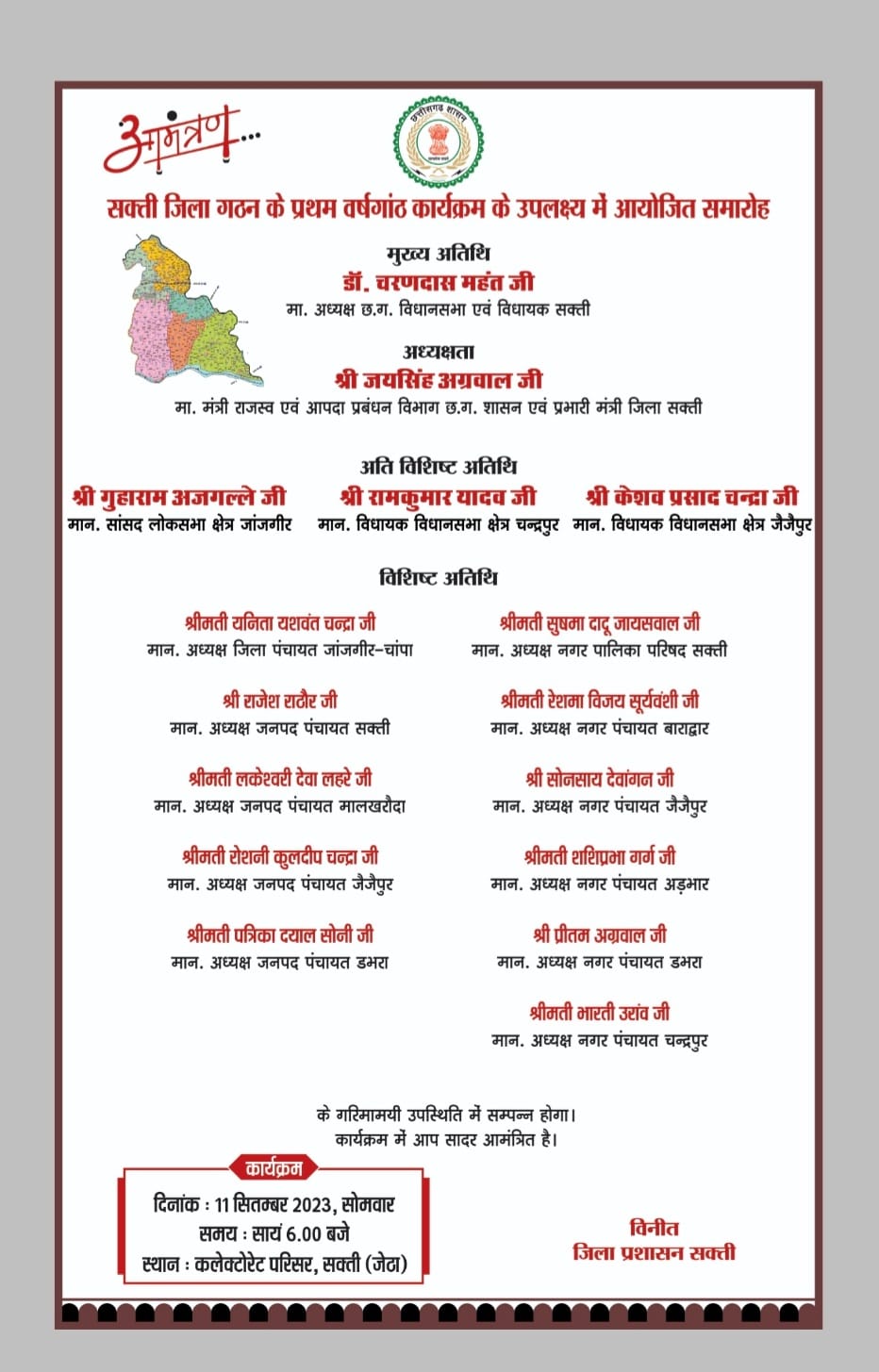 इसके साथ ही जिला वर्षगांठ समारोह में अति विशिष्ट अतिथि के रूप में सांसद लोकसभा क्षेत्र जांजगीर श्री गुहाराम अजगल्ले, विधायक विधानसभा क्षेत्र चंद्रपुर श्री रामकुमार यादव, विधायक विधानसभा क्षेत्र जैजैपुर श्री केशव प्रसाद चंद्रा शामिल होंगे। साथ ही कार्यक्रम में विशिष्ट अतिथि के रूप में अध्यक्ष जिला पंचायत जांजगीर चांपा श्रीमती यनिता यशवंत चंद्रा, अध्यक्ष जनपद पंचायत सक्ती श्री राजेश राठौर, अध्यक्ष जनपद पंचायत मालखरौदा श्रीमती लकेशवरी देवा लहरे, अध्यक्ष जनपद पंचायत जैजैपुर श्रीमती रोशनी कुलदीप चंद्रा, अध्यक्ष जनपद पंचायत डभरा श्रीमती पत्रिका दयाल सोनी, अध्यक्ष नगर पालिका परिषद सक्ती श्रीमती सुषमा दादू जायसवाल, अध्यक्ष नगर पंचायत बाराद्वार श्रीमती रेशमा विजय सूर्यवंशी, अध्यक्ष नगर पंचायत जैजैपुर श्री सोनसाय देवांगन, अध्यक्ष नगर पंचायत अडभार श्रीमती शशिप्रभा गर्ग, अध्यक्ष नगर पंचायत डभरा श्री प्रीतम अग्रवाल, अध्यक्ष नगर पंचायत चंद्रपुर श्रीमती भारती उरांव के गरिमामय उपस्थिति में संपन्न होगा। इसके साथ ही जिला गठन के प्रथम वर्षगांठ के अवसर पर समारोह स्थल पर विभिन्न विभागों द्वारा जिला गठन के बाद से 1 वर्ष के अंदर विभिन्न विभागीय योजना अंतर्गत किए गए उल्लेखनीय और विशेष कार्यों को प्रदर्शित भी किया जाएगा।