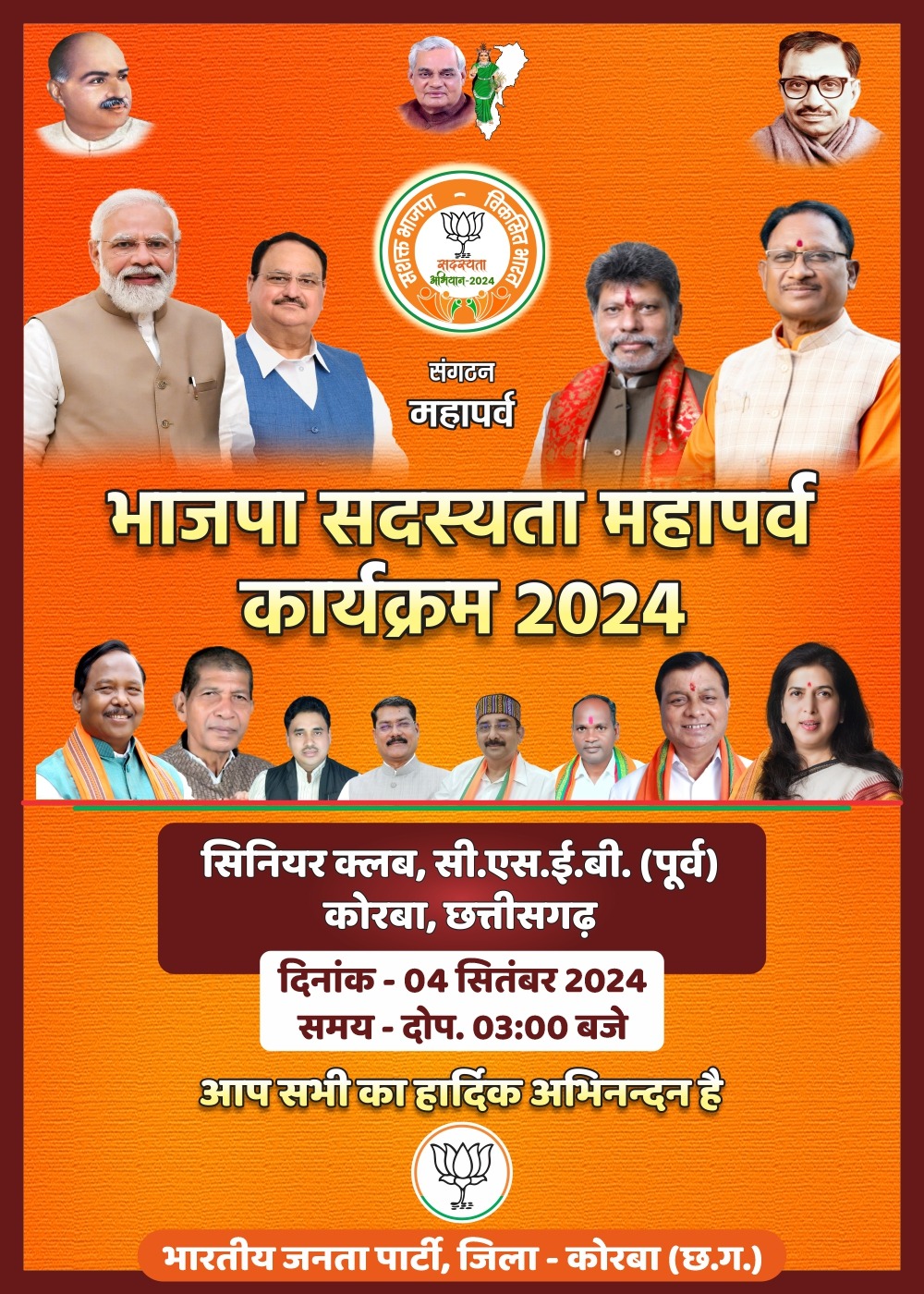 : भाजपा सदस्यता महापर्व कार्यक्रम का शुभारंभ 4 सितंबर को ।