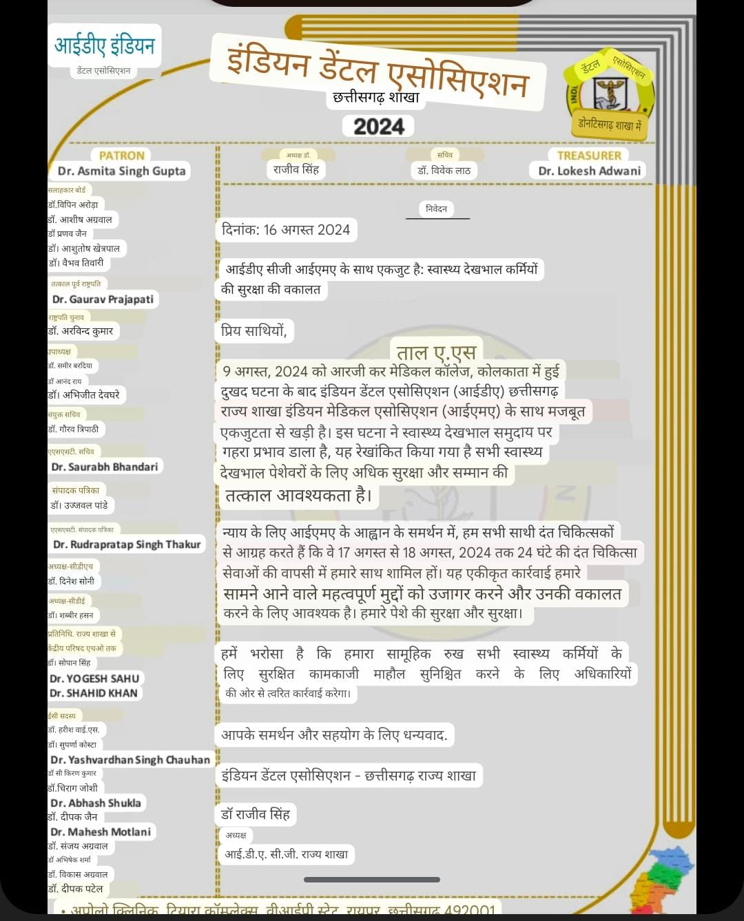 न्याय के लिए आईएमए के आह्वान के समर्थन में इंडियन डेंटल मेडिकल एसोसिएशन के सभी दंत चिकित्सक भी अपनी सेवाएं 17 अगस्त से 18 अगस्त तक 24 घंटे के लिए बंद रखकर अपना समर्थन देंगे।
