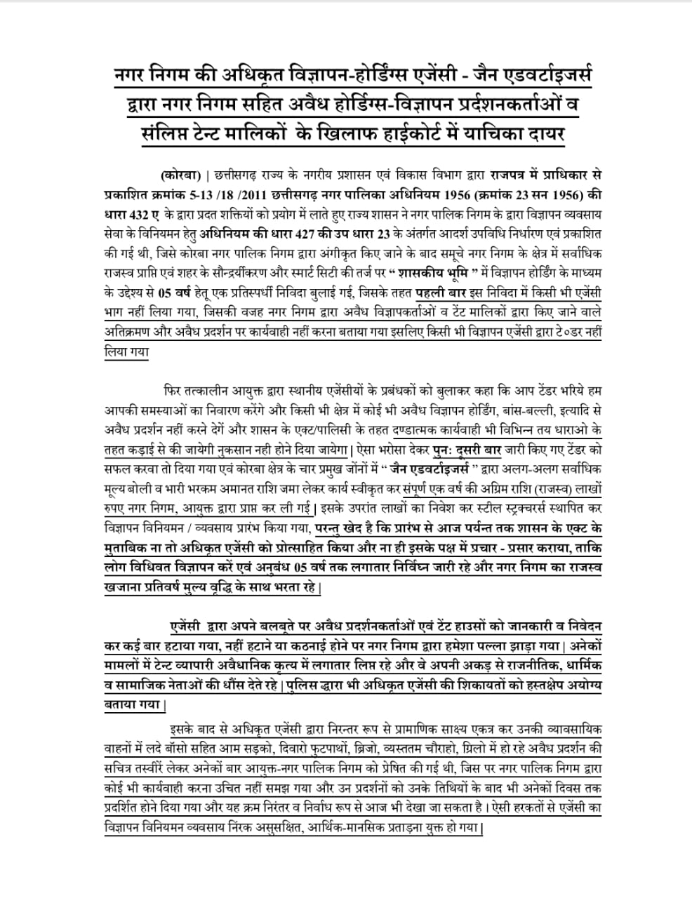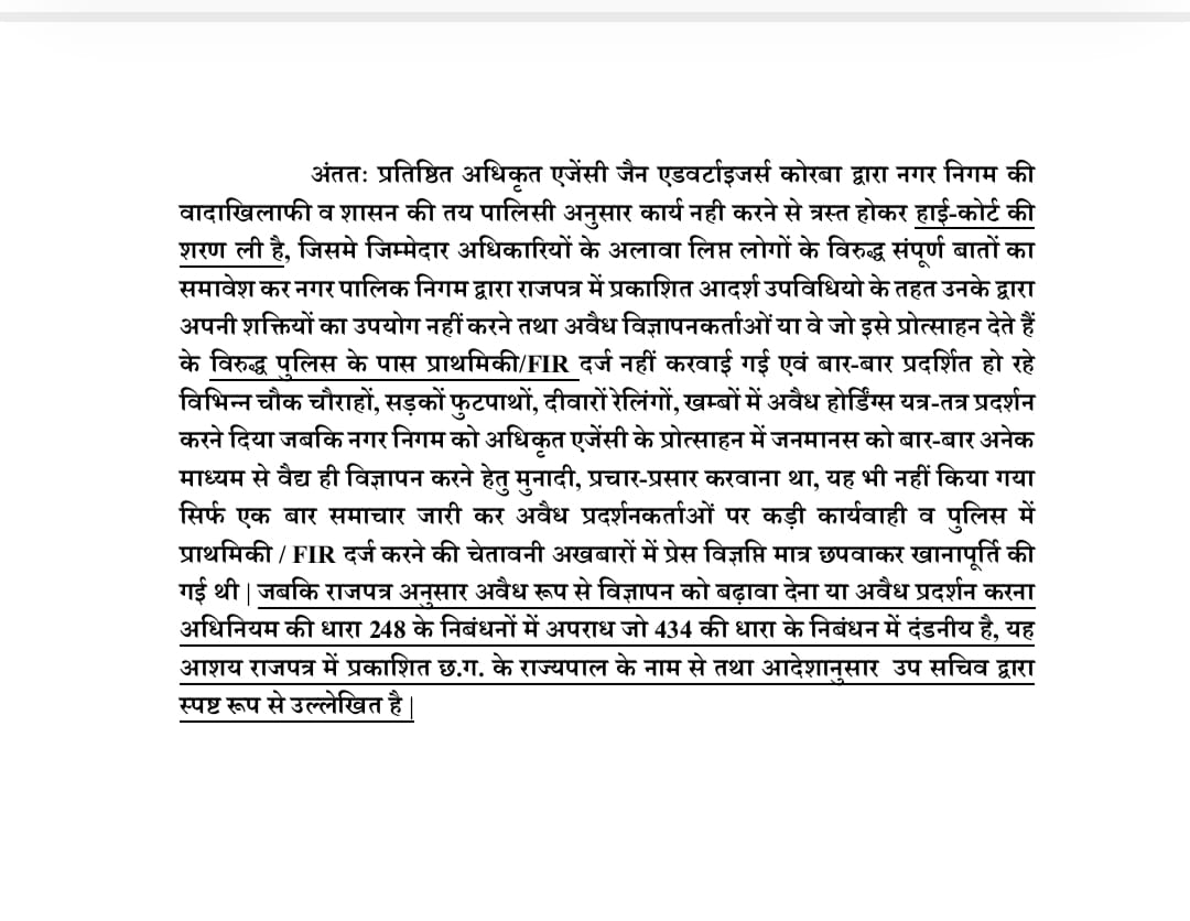 अंततः प्रतिष्ठित अधिकृत एजेंसी जैन एडवर्टाइजर्स कोरबा द्वारा नगर निगम की वादाखिलाफी व शासन की तय पालिसी अनुसार कार्य नही करने से त्रस्त होकर हाई-कोर्ट की शरण ली है।