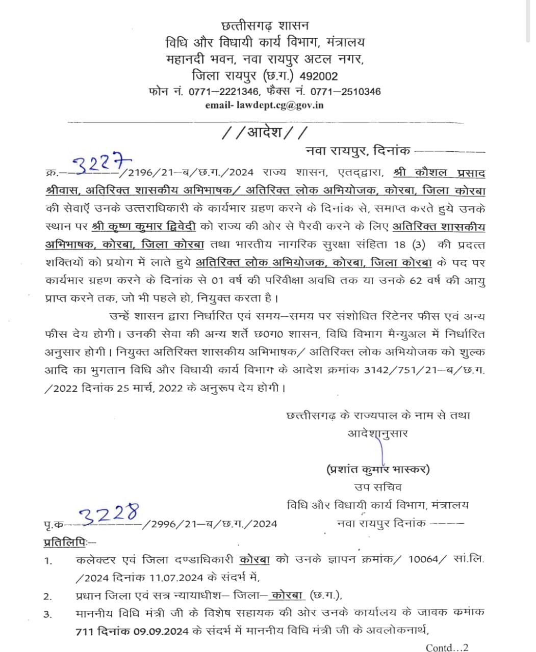 राज्य सरकार के द्वारा अधिवक्ता कृष्ण कुमार द्विवेदी को राज्य की ओर से पैरवी करने के लिए शासकीय अभिभाषक कोरबा ,तथा भारतीय नागरिक सुरक्षा संहिता 18 (3) द्वारा प्रदत शक्तियों को प्रयोग में लाते हुए लोक अभियोजन कोरबा के पद पर कार्यभार ग्रहण करने के लिए सूचना जारी कर दी गई है ।