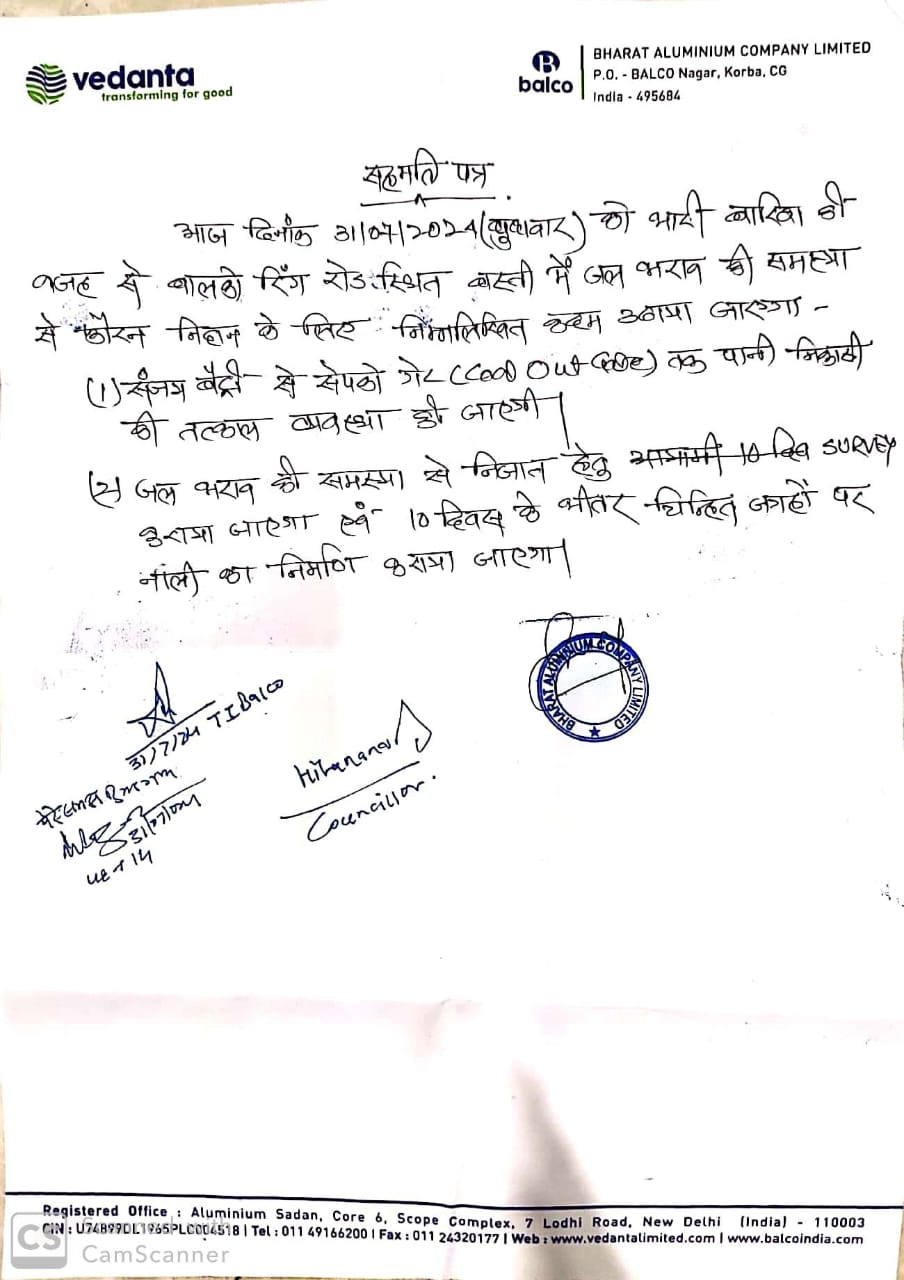 बालको के अधिकारियों एवं जनता के बीच पुलिस प्रशासन की मध्यस्थता से बालको अधिकारी सुमंत सिंह ने पानी निकासी की व्यवस्था एवं नाली निर्माण का दिया लिखित आश्वासन।