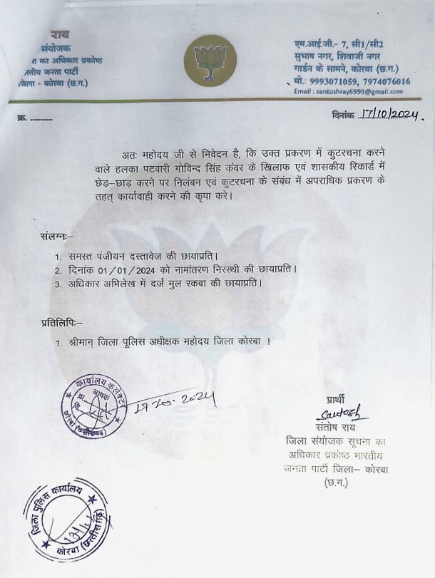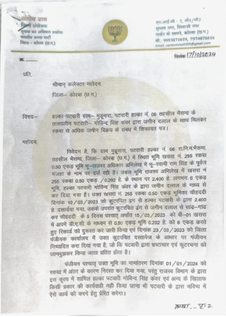 कोरबा( न्यूज उड़ान )भारतीय जनता पार्टी के सूचना के अधिकार प्रकोष्ठ के जिला संयोजक संतोष राय ने पत्र के माध्यम से जिला कलेक्टर को पटवारी गोविंद सिंह कंवर द्वारा जमीन दलालों के साथ मिलकर किए गए कटु रचना के बारे में जिला कलेक्टर को अवगत कराया है।