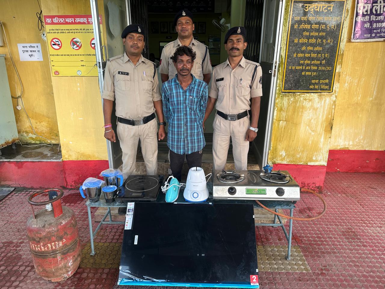 कि दिनांक 03.08.24 के शाम को टीआई मैडम बिलासपुर जा रही हूं घर का देखभाल करना बोली थी कि दिनांक 25.08.24 के शाम 05.00 बजे क्वाटर में काम करने गयी तो देखी कि बाहर लोहा का गेट में ताला लगा हुआ था लेकिन अंदर दरवाजा टूटा हुआ था तब अपने पति बुधराम को बताई दोनों अन्दर जाकर देखे तो घर का सामान बिखरा पड़ा था तथा घर में रखे एलईडी टीवी, गैस सिलेण्डर, एक नग गैस चूल्हा, एक नग इंडक्शन चुल्हा, एक नग मिक्सी, एक नग आयरन एवं घरेलू बर्तन कीमती 35000 रूप्य को कोई अज्ञात चोर के द्वारा चोरी कर ले गया था।