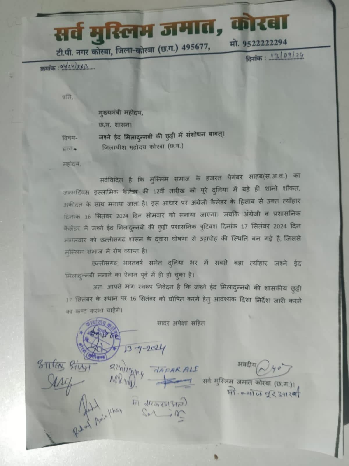 : सर्व मुस्लिम जमात कोरबा ने जश्ने ईद मिलादुन्नबी की छुट्टी में तत्काल संशोधन हेतु मुख्यमंत्री के नाम से कलेक्टर कोरबा को सौंपा ज्ञापन।