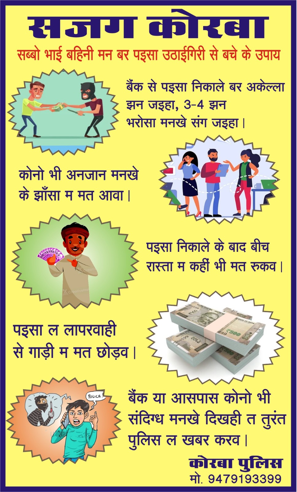 पुलिस टीम के द्वारा बैंक एटीएम में पैंपलेट चस्पा करने का उद्देश्य यह है कि कोरबा जिला के सरहदी जिलों में कृषकों के साथ हो रहे उठाईगीरी की घटनाओं को देखते हुए कृषक भाई लोग धान खरीदी केंद्र एवं बैंकों में पैसे निकलते एवं डालते समय इन सब बातों का ध्यान दें इसलिए पुलिस के द्वारा हिंदी एवं छत्तीसगढ़ी भाषा में सजग कोरबा के तहत पैंपलेट को चस्पा किया गया है और लोगों को इस संबंध में जागरूक किया जा रहा है।