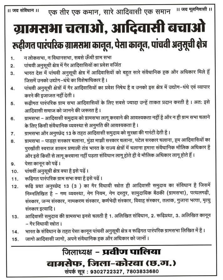 कार्यक्रम के मुख्य अतिथि बामसेफ कोरबा जिला अध्यक्ष प्रवीण पालिया जी थे, जिन्होंने अपने संबोधन में पाँचवी अनुसूची और पेसा (ग्राम सभा) कानून पर विस्तार से चर्चा की। विशिष्ट अतिथियों में फादर विजय तिग्गा, फादर अशोक मांझी, और फादर सुमन मिंज शामिल थे।