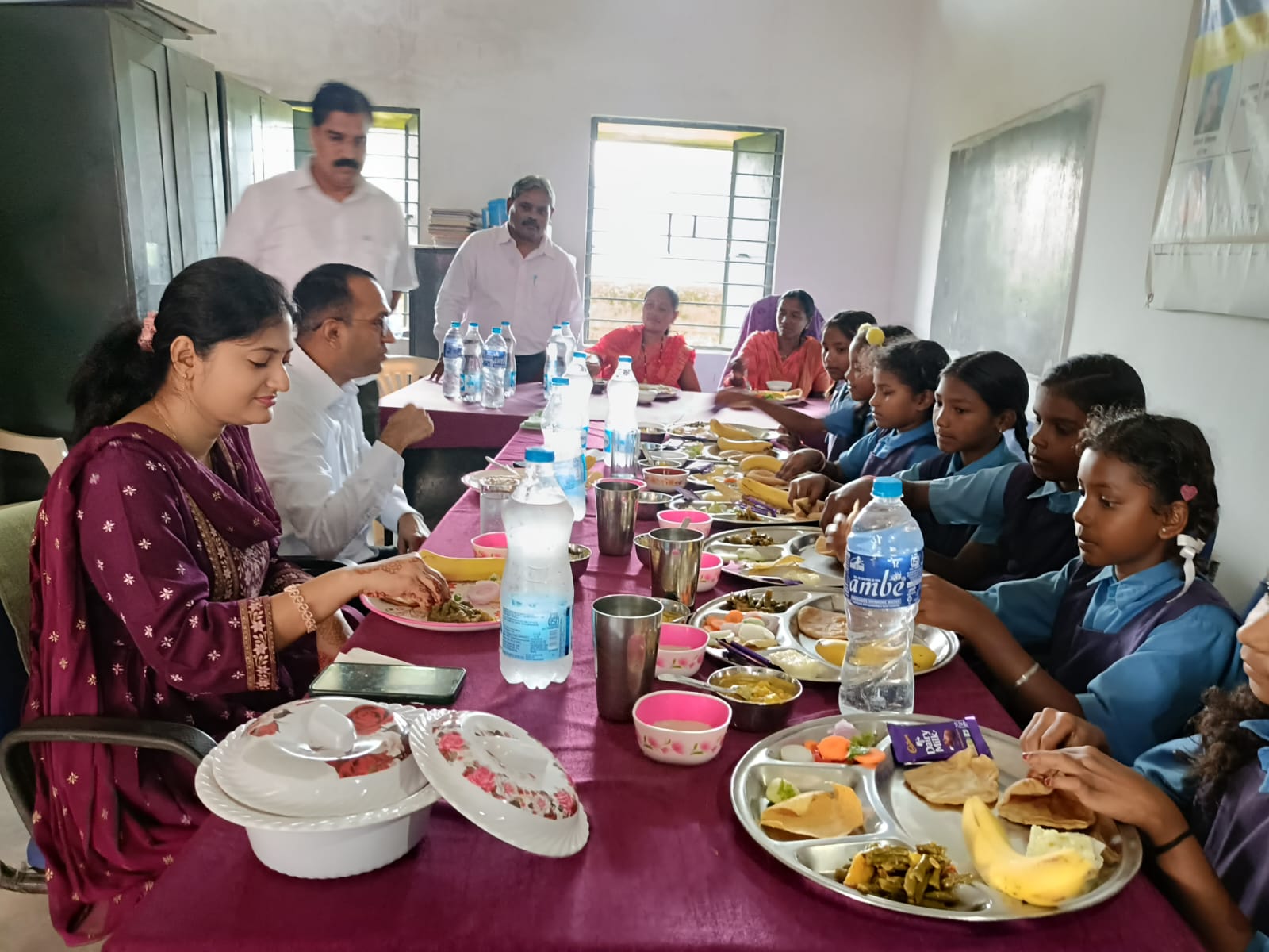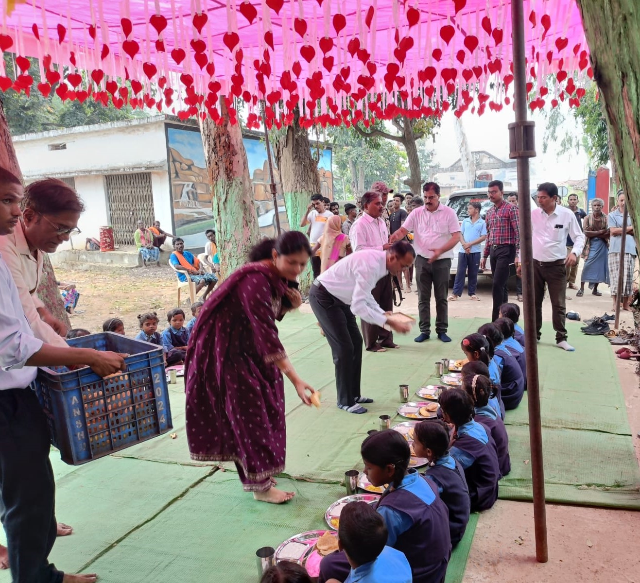: कलेक्टर ने न्योता भोज में शामिल होकर बच्चों को परोसा भोजन।