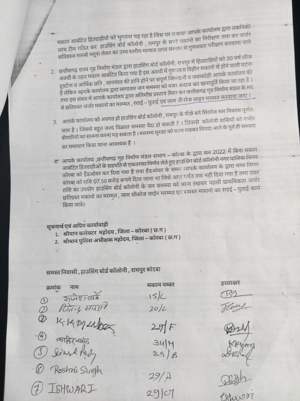 कोरबा( न्यूज उड़ान )छत्तीसगढ़ के गृह निर्माण मंडल के कार्यपालन अभियंता ने कॉलोनी वाशियो के साथ किया दूर व्यवहार मामला हैं कोरबा जिले के हाउसिंग बोर्ड कॉलोनी रामपुर का इस वक्त हाउसिंग बोर्ड कॉलोनी में परेशानियों का अंबार टूट पड़ा हैं ।
