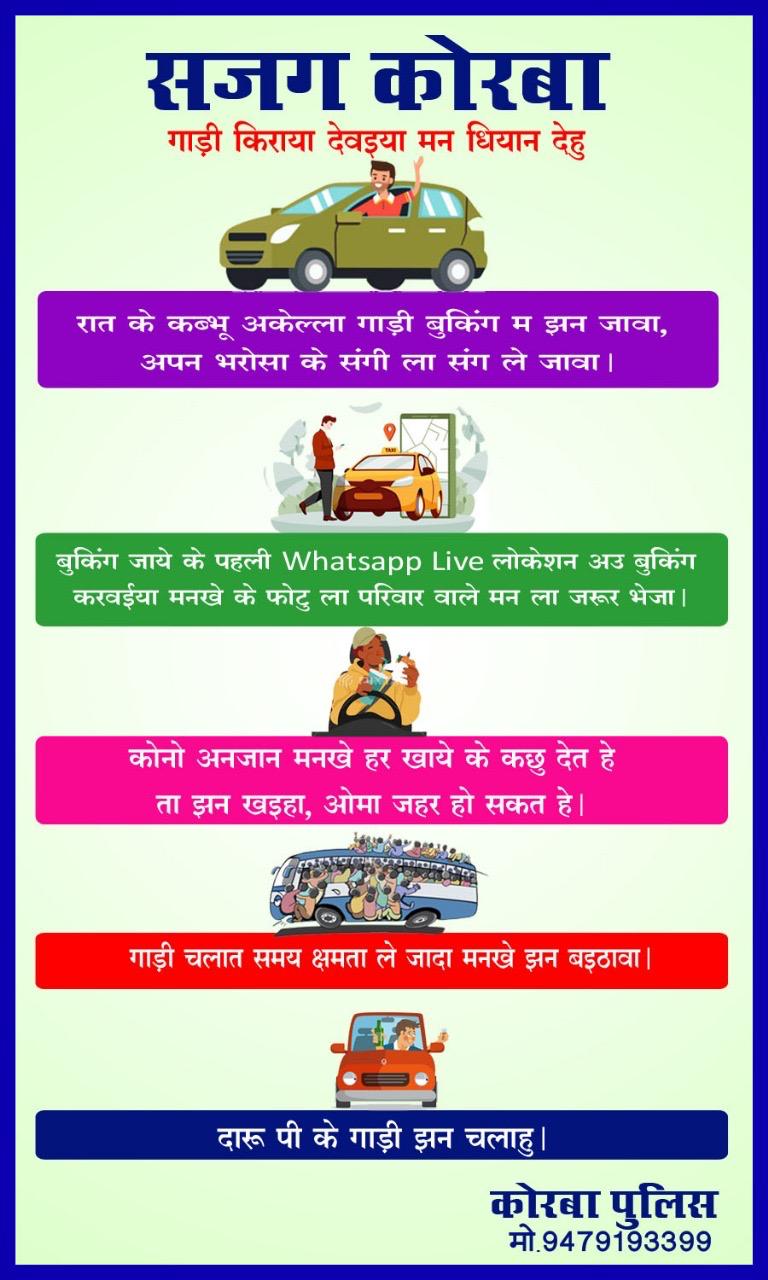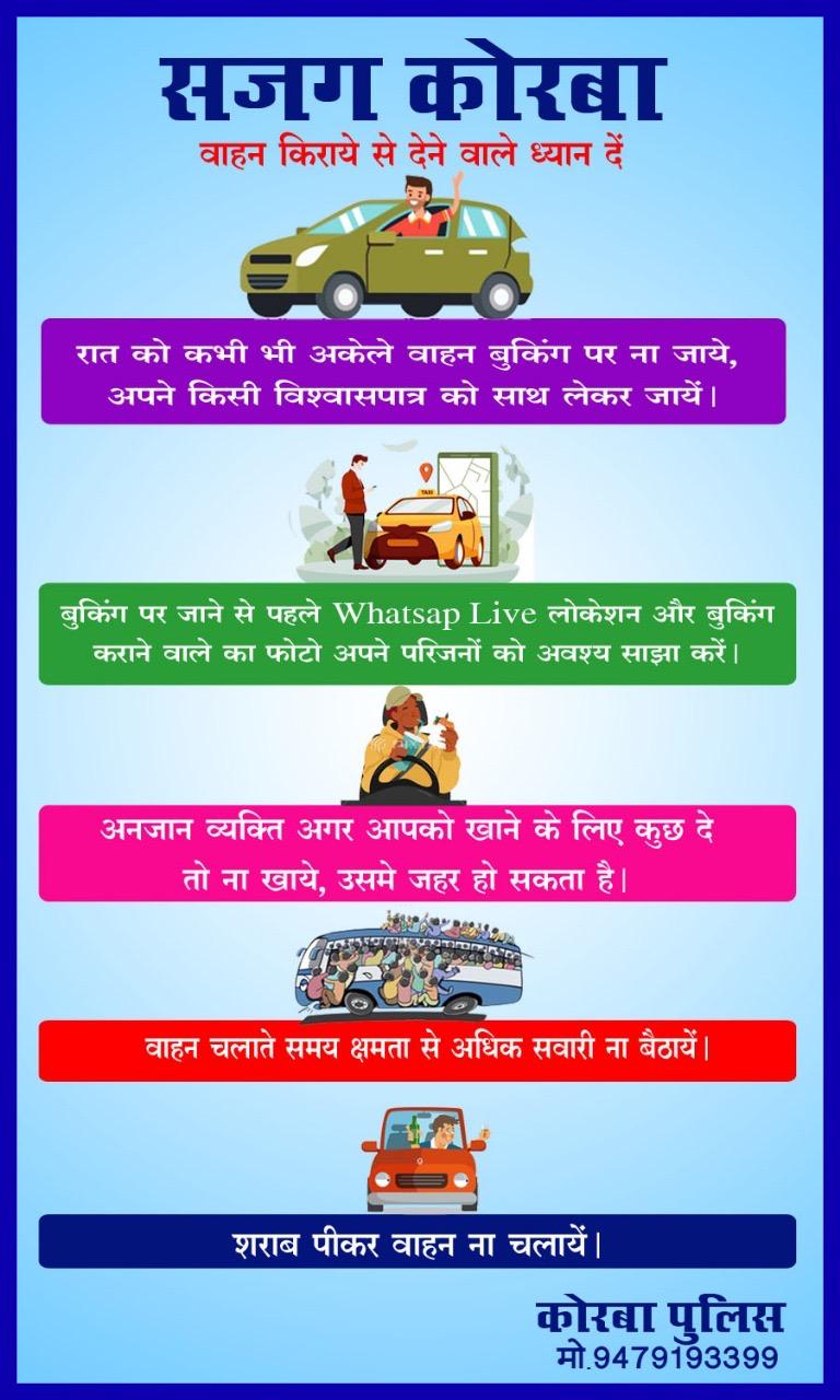 पुलिस के द्वारा हिंदी एवं छत्तीसगढ़ी भाषा में सजग कोरबा के तहत पैंपलेट के माध्यम से वाहन किराए से देने वाले ध्यान दें :-