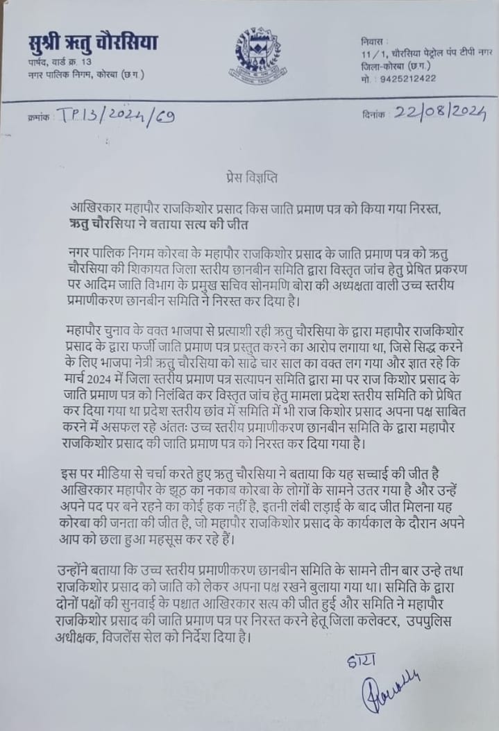 कोरबा (न्यूज उड़ान )नगर पालिक निगम कोरबा के महापौर राजकिशोर प्रसाद के जाति प्रमाण पत्र को ऋतु चौरसिया की शिकायत जिला स्तरीय छानबीन समिति द्वारा विस्तृत जांच हेतु प्रेषित प्रकरण पर आदिम जाति विभाग के प्रमुख सचिव सोनमणि बोरा की अध्यक्षता वाली उच्च स्तरीय प्रमाणीकरण छानबीन समिति ने निरस्त कर दिया है।