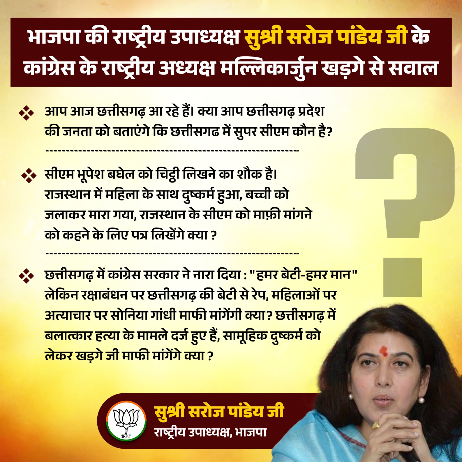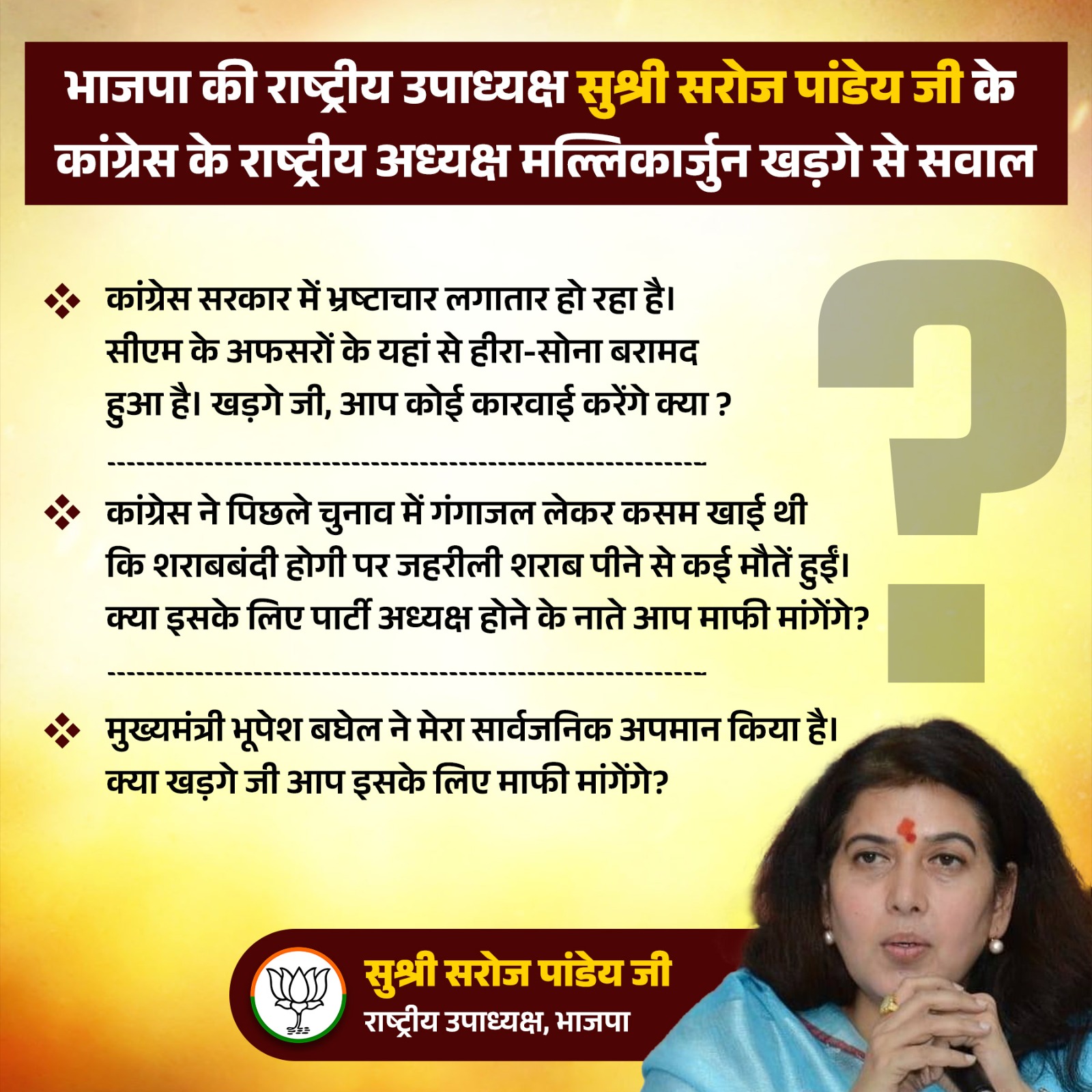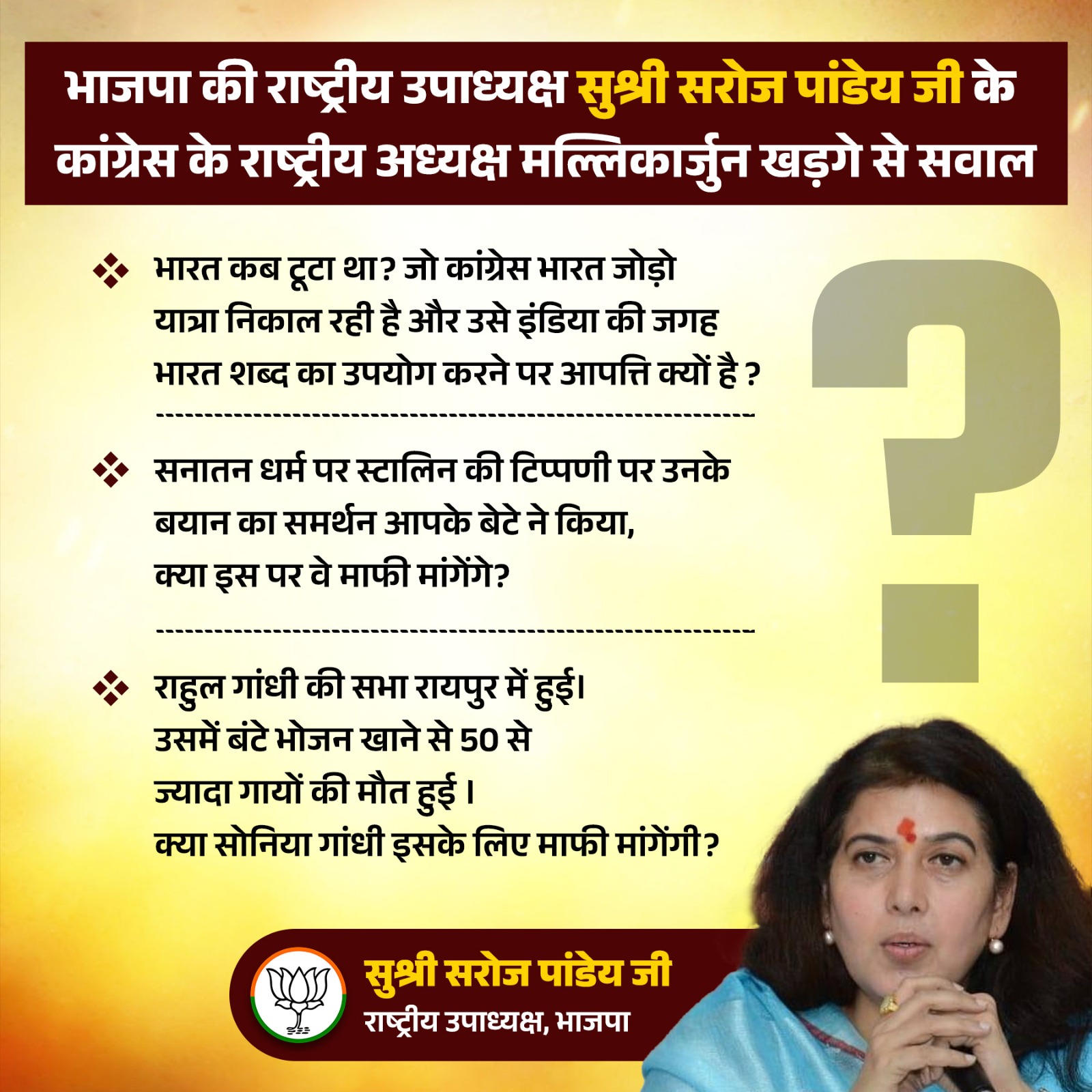 : भाजपा राष्ट्रीय उपाध्यक्ष सरोज पांडेय ने कांग्रेस अध्यक्ष खड़गे से पूछे 9 सवाल
