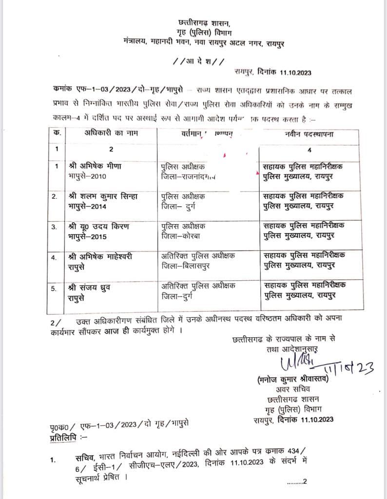 रायपुर । भारत निर्वाचन आयोग के निर्देश पर छत्तीसगढ़ राज्य के 2 कलेक्टर, 3 पुलिस अधीक्षक और दो अतिरिक्त पुलिस अधीक्षकों तथा खाद्य विभाग के विशेष सचिव मनोज सोनी को तत्काल प्रभाव से हटाए जाने के मामले की चर्चा अभी लोगों के बीच चल ही रही है कि निर्वाचन आयोग के निर्देश पर छत्तीसगढ़ शासन के सामान्य प्रशासन और गृह (पुलिस) विभाग मंत्रालय के द्वारा इन्हें नई पदस्थापना प्रदान कर दी गई है।