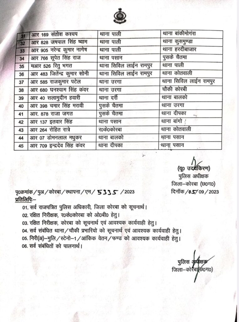 कोरबा/ छत्तीसगढ़ के कोरबा जिले में बड़े पैमाने पर पुलिस विभाग में तबादला हुआ है। एसपी यू उदय किरण ने लंबे समय से एक स्थान पर जमे पुलिस आरक्षकों का तबादला किया है। इस बाबत एसपी ने आदेश जारी कर दिया है।