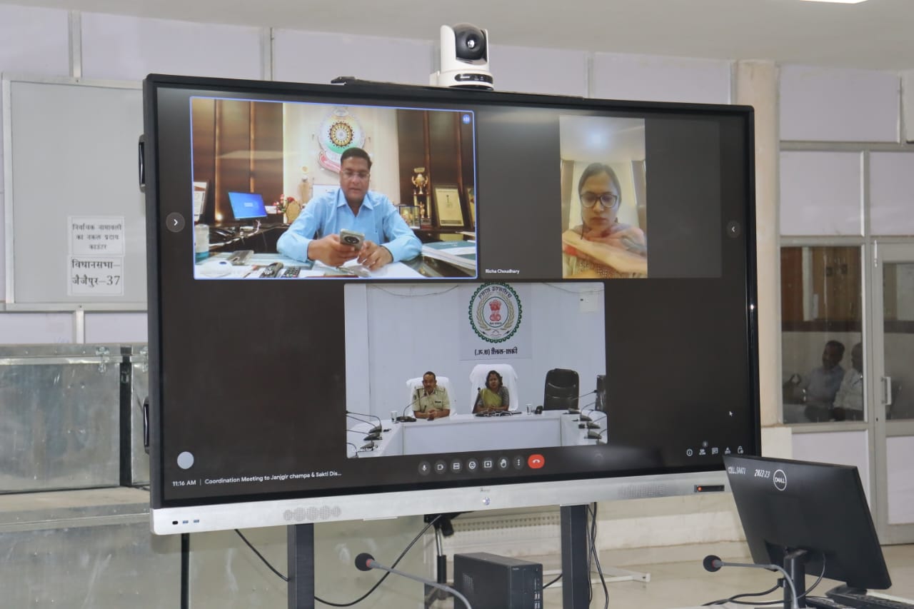 सक्ती  विधानसभा निर्वाचन 2023 के सुव्यवस्थित क्रियान्वयन के लिए सक्ती जिले की कलेक्टर श्रीमती नूपुर राशि पन्ना व पुलिस अधीक्षक श्री एम आर आहिरे तथा जांजगीर चांपा जिले की कलेक्टर सुश्री ऋचा प्रकाश चौधरी व पुलिस अधीक्षक श्री विजय अग्रवाल ने बेहतर कॉर्डिनेशन के लिए आज वीडियो कांफ्रेंसिंग के माध्यम से मीटिंग ली। वीडियो कांफ्रेंसिंग में दोनों जिलों के कलेक्टर, एसपी द्वारा विधानसभा क्षेत्रों में निर्वाचन को सुचारू रूप से संपादित कराने के लिए आवश्यक चर्चा की गई। वीडियो कांफ्रेंसिंग में दोनों जिलों के कलेक्टर एसपी शामिल हुए।