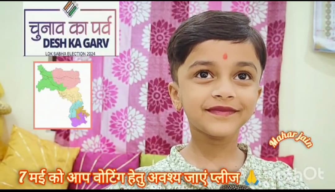 इसी क्रम में भारत निर्वाचन आयोग के द्वारा मतदाता जागरूकता अभियान पूरे देश में चलाया जा रहा है , कोरबा लोकसभा अंतर्गत मनेद्रगढ़ चिरमिरी भरतपुर के कलेक्टर एवं जिला निर्वाचन अधिकारी डी आर वेंकट से प्रेरित होकर मेहर जैन ने छोटे से गीत के माध्यम से जिले के समस्त मतदाताओं से शतप्रतिशत मतदान हेतु विनम्र अपील की है गीत के माध्यम से मेहर न 7मई को इधर उधर जाने का बहाना नही बनाने और मतदान कर फर्ज निभाने हेतु अनुरोध किया है।