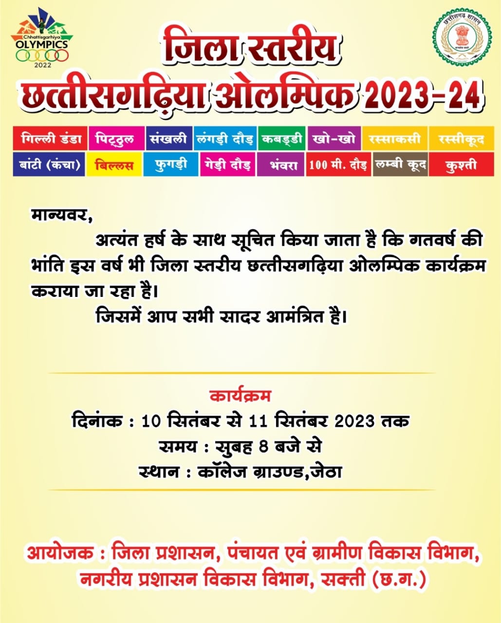 छत्तीसगढ़िया ओलंपिक का आयोजन 10 और 11 सितम्बर 2023 को कलेक्ट्रेट मैदान जेठा में आयोजित कराया जा रहा है। जिला स्तरीय छत्तीसगढ़िया ओलंपिक खेल का शुभारंभ 10 सितंबर को सुबह 8 बजे जिला मुख्यालय सक्ती के कलेक्ट्रेट मैदान जेठा में किया जाएगा। आयोजन अंतर्गत 10 सितम्बर को 100 मीटर दौड़, गेंड़ी दौड़, लंगड़ी दौड़, फुगड़ी, बिल्लस, भौंरा, लम्बीकूद, रस्सीकूद, कबड्डी, संखली एवं खो-खो खेल का आयोजन होगा। इसी तरह 11 सितम्बर को गिल्ली डंडा, कंचा (बांटी), कुश्ती, पिट्ठूल और रस्साकसी खेल का आयोजन होगा।